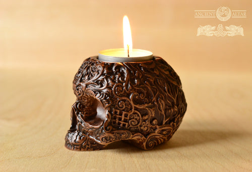 Skull Candle holder, Pagan candlestick, Scandinavian, home altar, sugar skull, runes, norse, viking, heathen, santa muerte