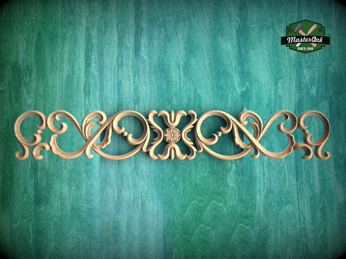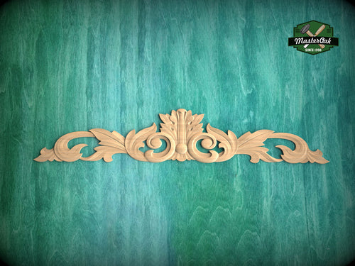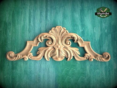 Wooden scrolled center applique, Unpainted wall embellishments, carved flower, horizontal decor, carved decoration of wood, wooden onlay
