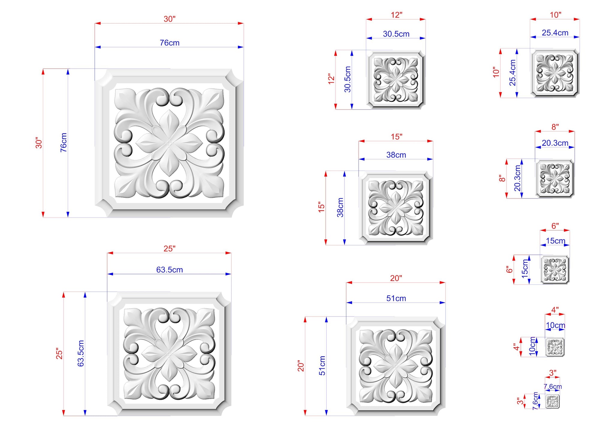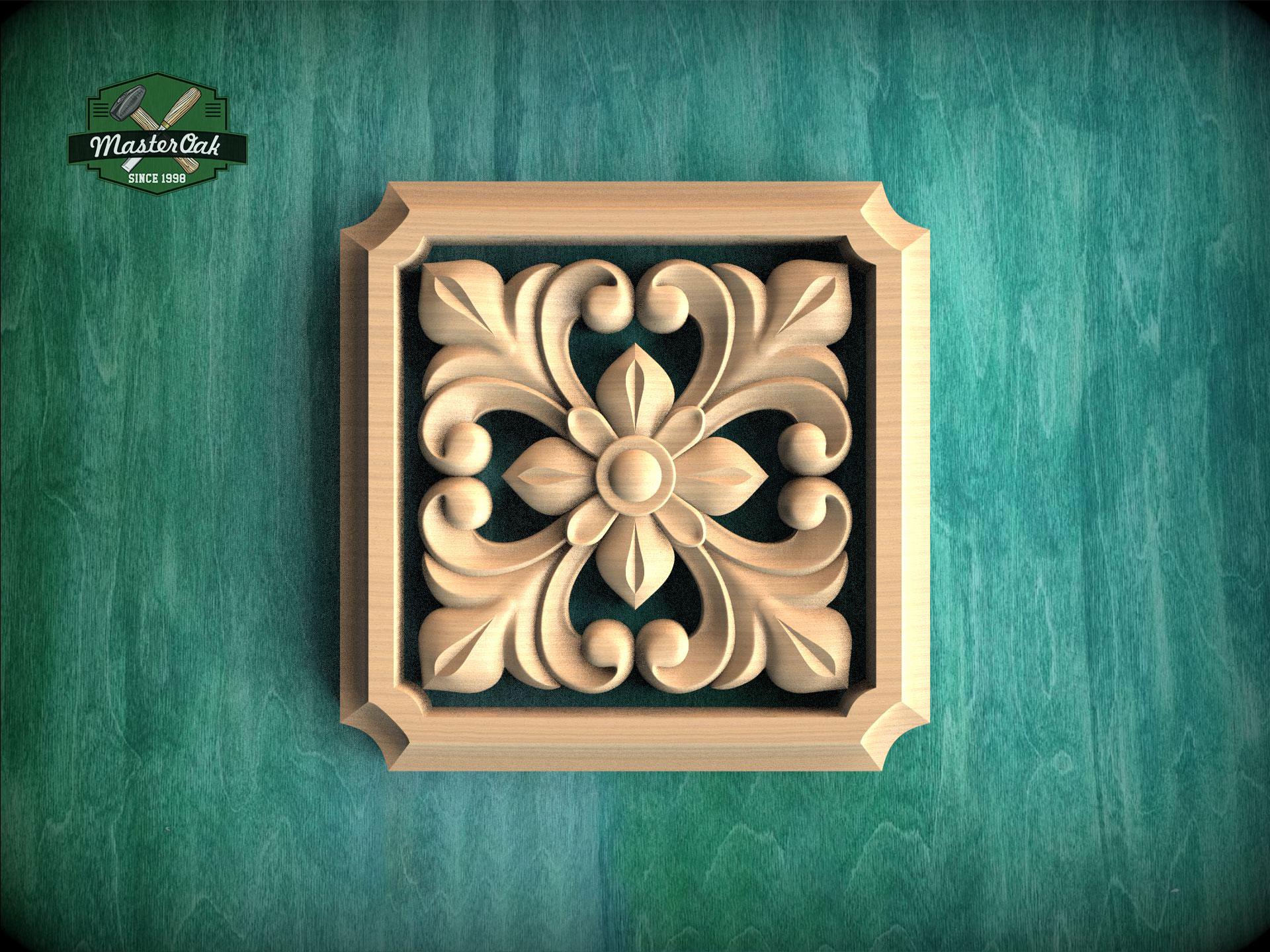 A baroque-inspired bloom unfolds inside a beveled square, where soft curls meet structured edges. Light settles on the sculpted leaves, giving the piece a refined presence for doors, panels, and furniture accents.