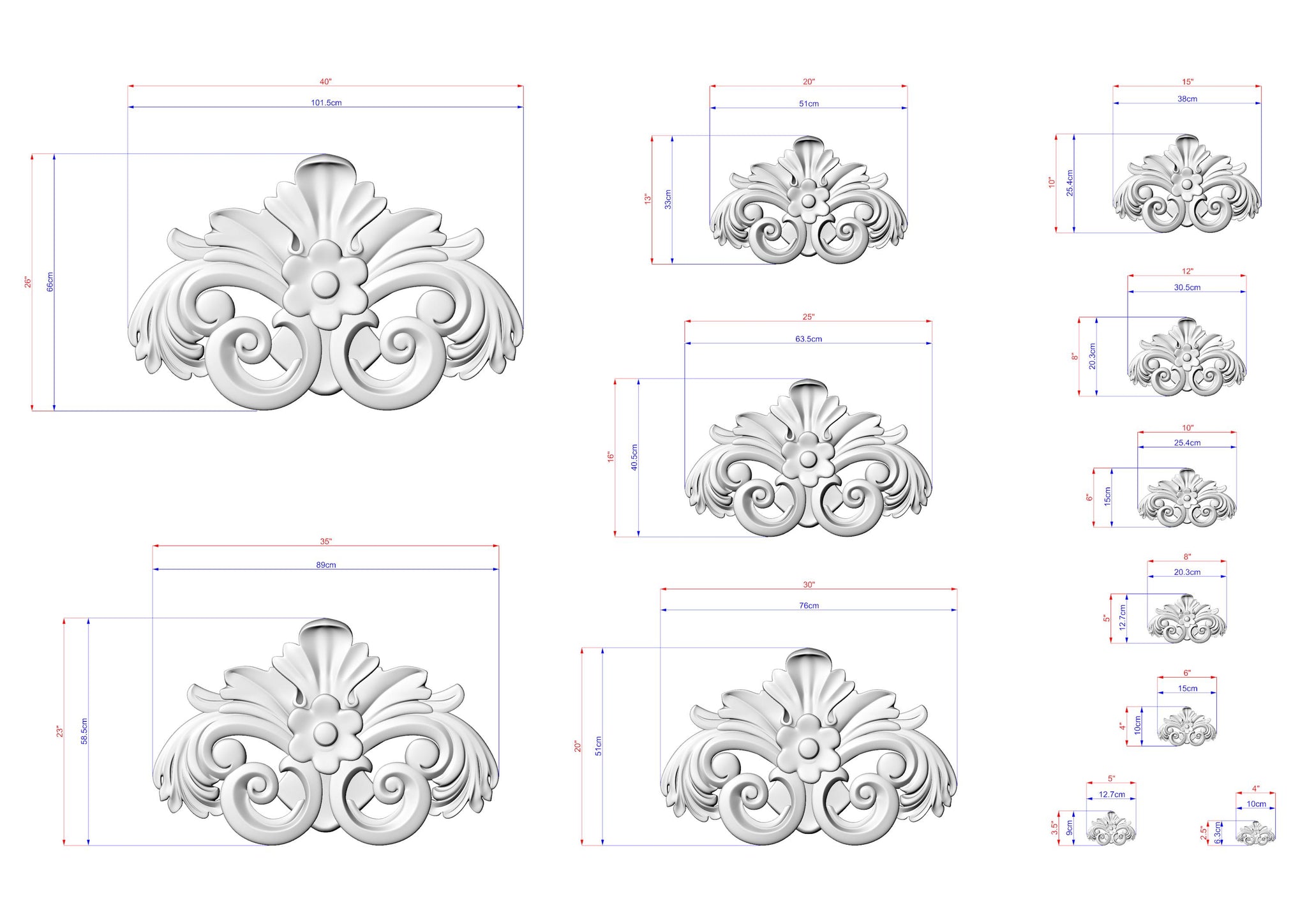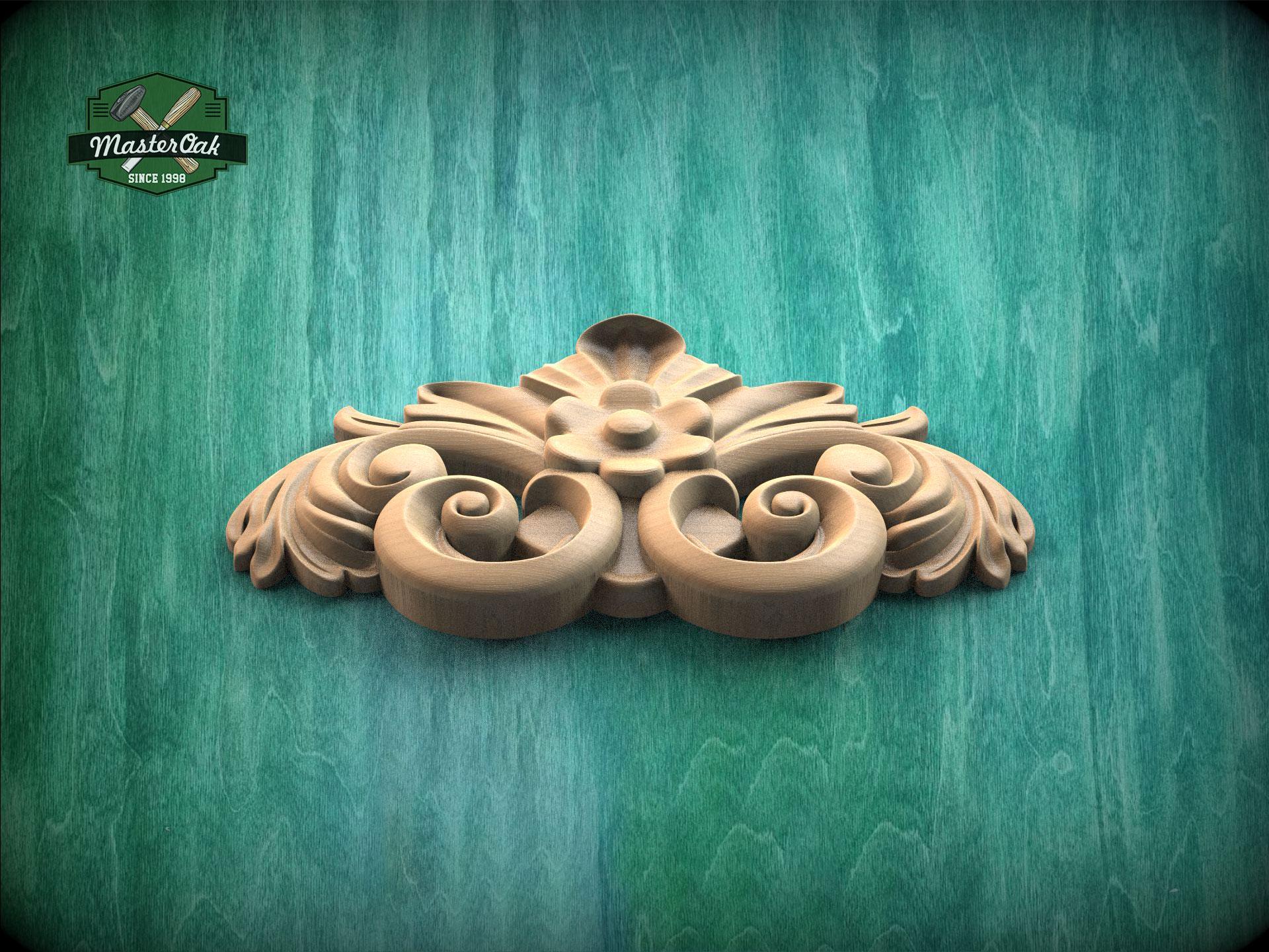 A small crest with a central flower bloom framed by graceful scrolls. Ideal for mirrors, doors, or furniture details, it introduces gentle rhythm and refined charm.