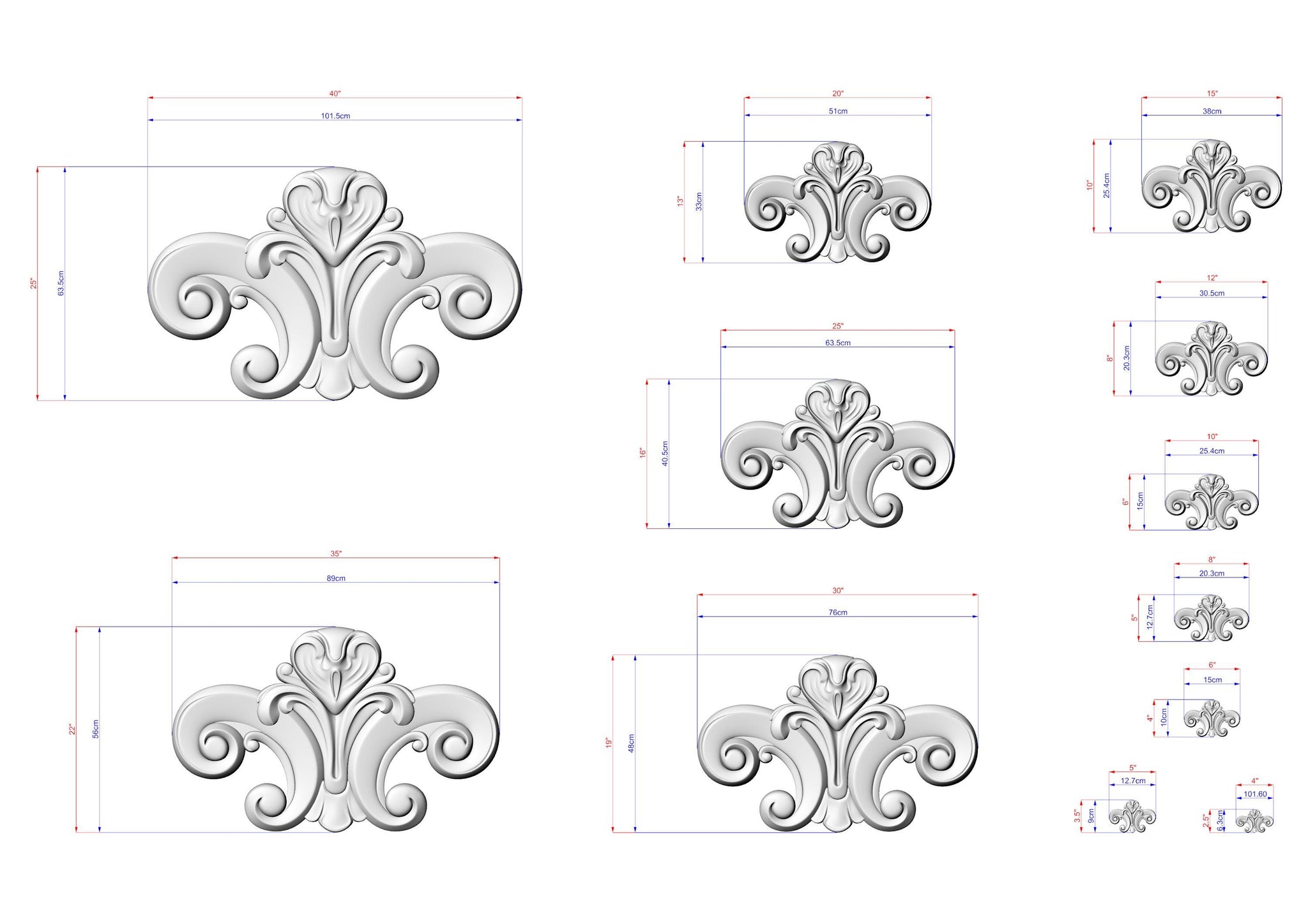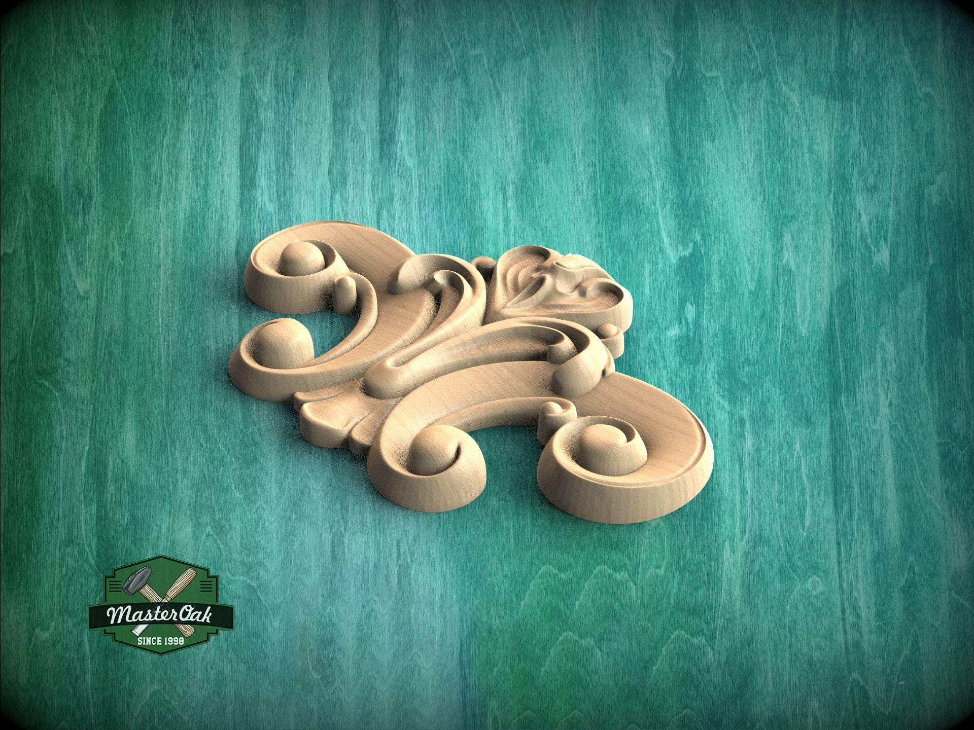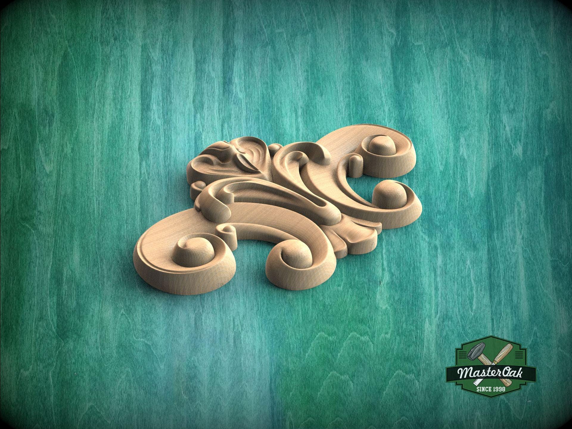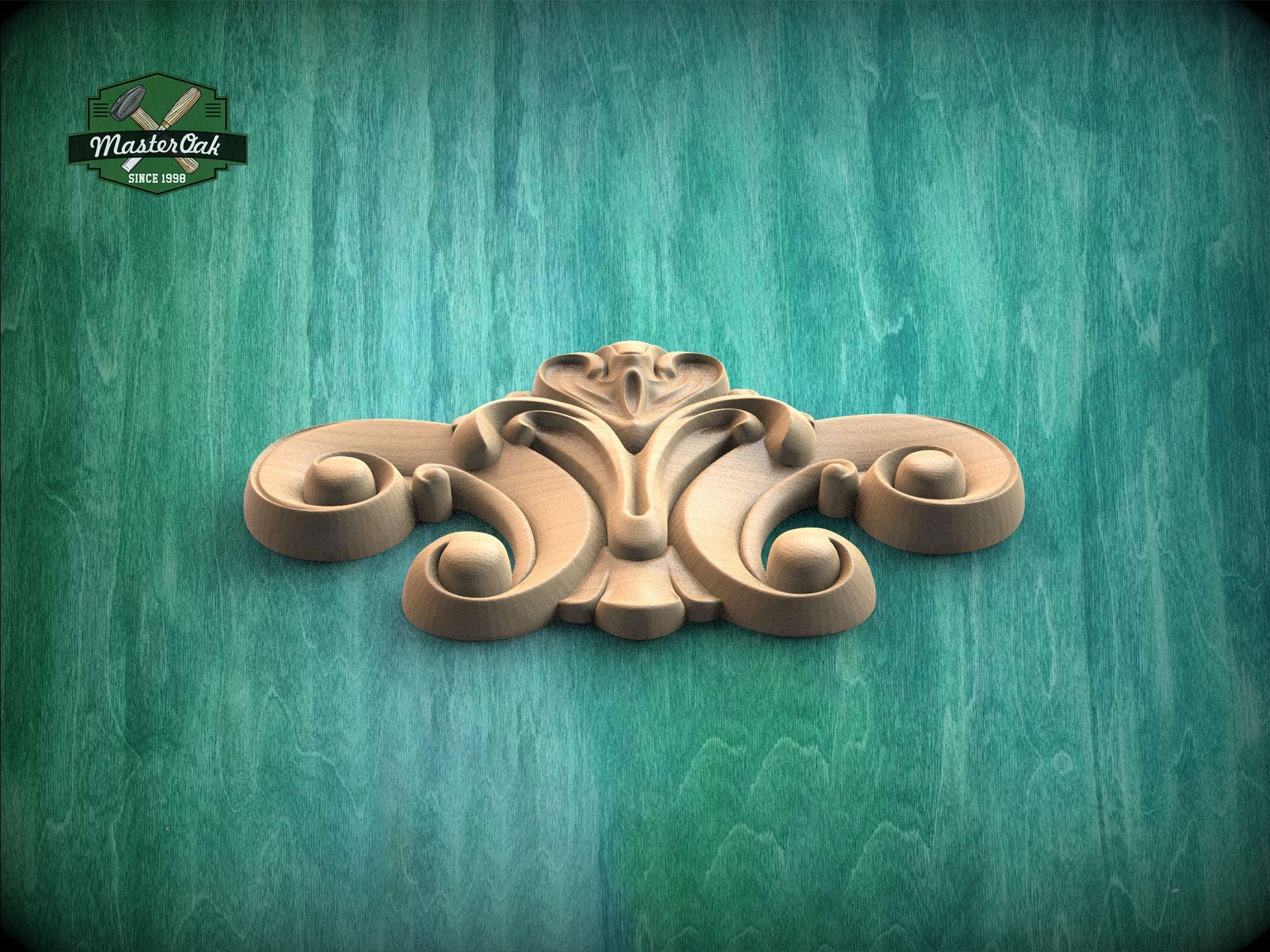 A symmetrical ornament with bold scrolls and a central relief. Perfect for mirrors, furniture panels, or doors, it highlights structure and harmony in décor. Its sculptural form adds depth and balance.