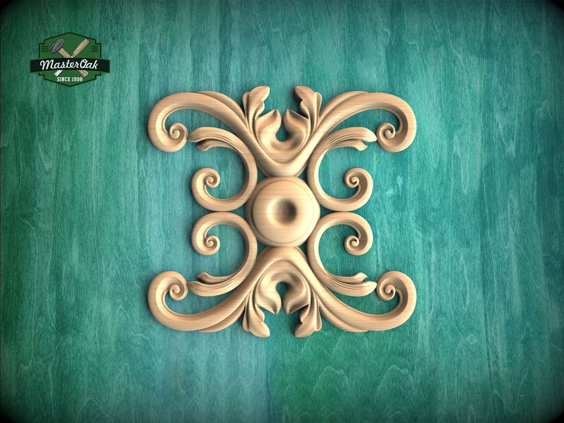 An elegant wood carving built around a central round motif framed by flowing scrolls. Its compact form and gentle rhythm make it perfect for doors, cabinets, and interior wall accents.