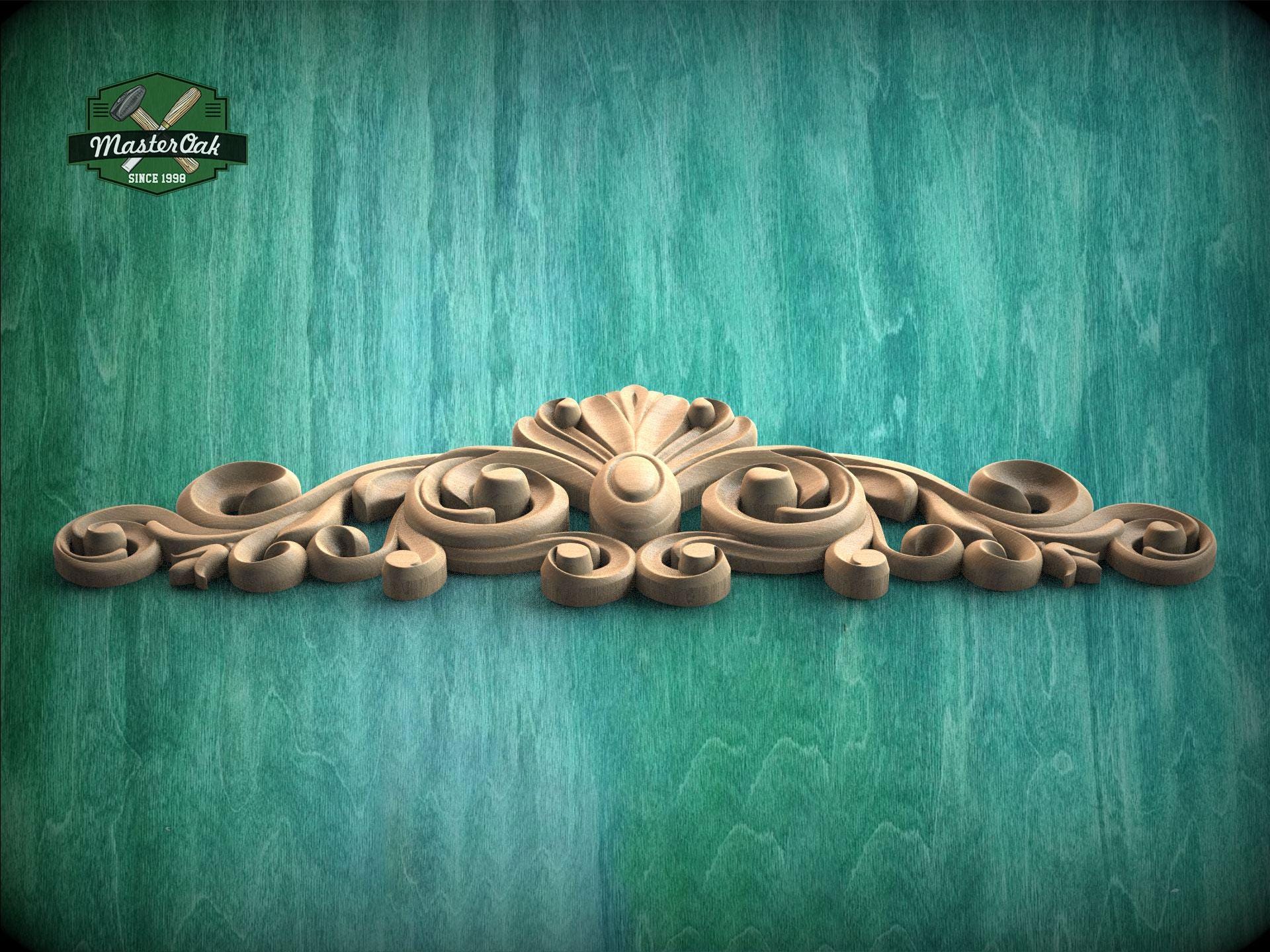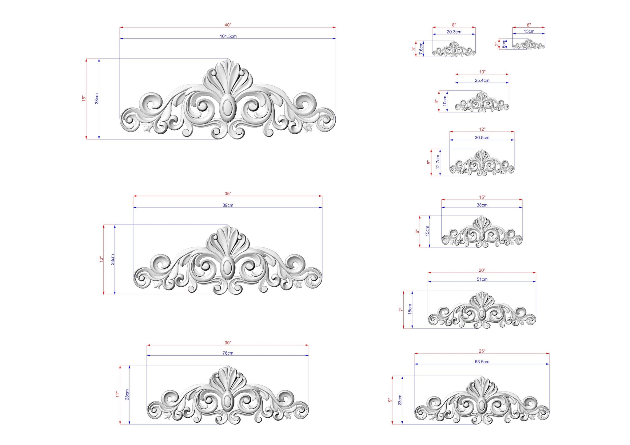 A decorative crest with a fan-shaped centerpiece framed by elegant scrolls. Ideal for mirrors, doors, or cabinetry, it emphasizes rhythm and symmetry. A sculptural piece that unites boldness and refinement.