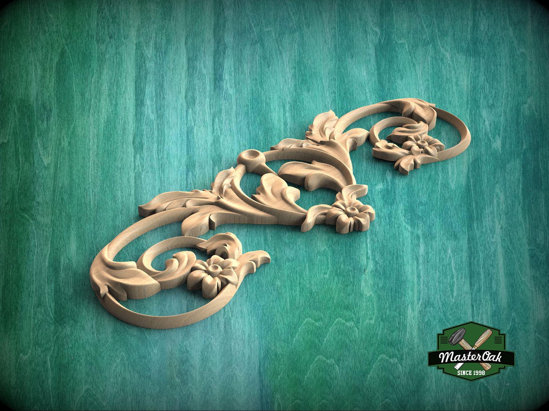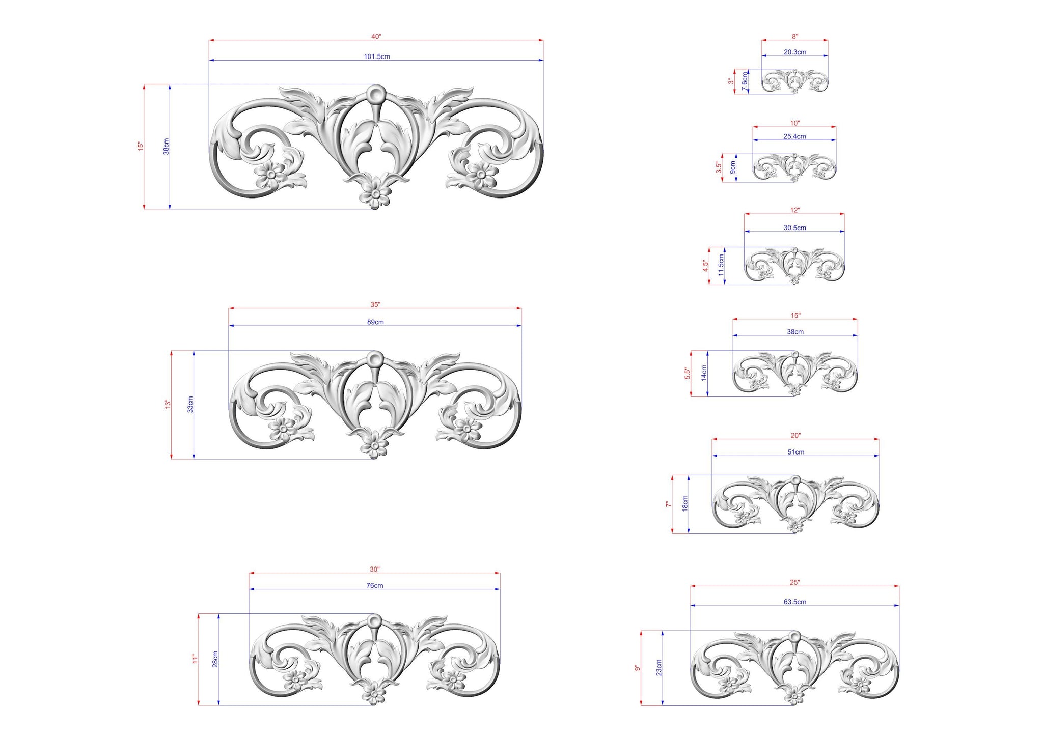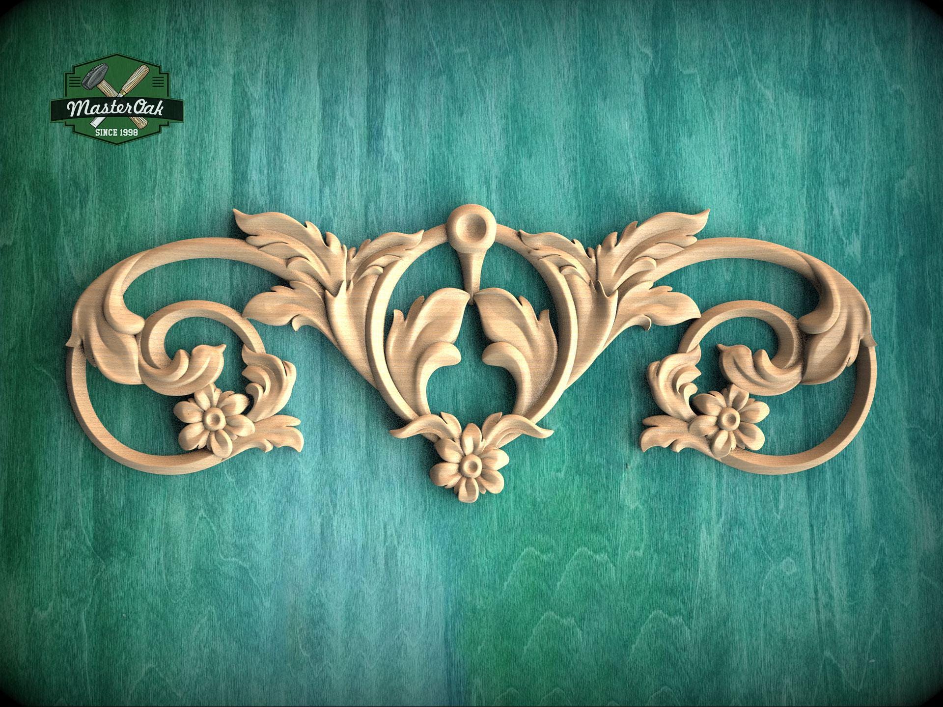 This horizontal decorative applique features flowing scrolls and a balanced floral center that draws the eye without overpowering the space. It works beautifully on furniture, doors, and wall panels as a refined visual accent. The design blends symmetry with soft movement, adding harmony to classic interiors. Ideal for projects that need an elegant finishing detail.