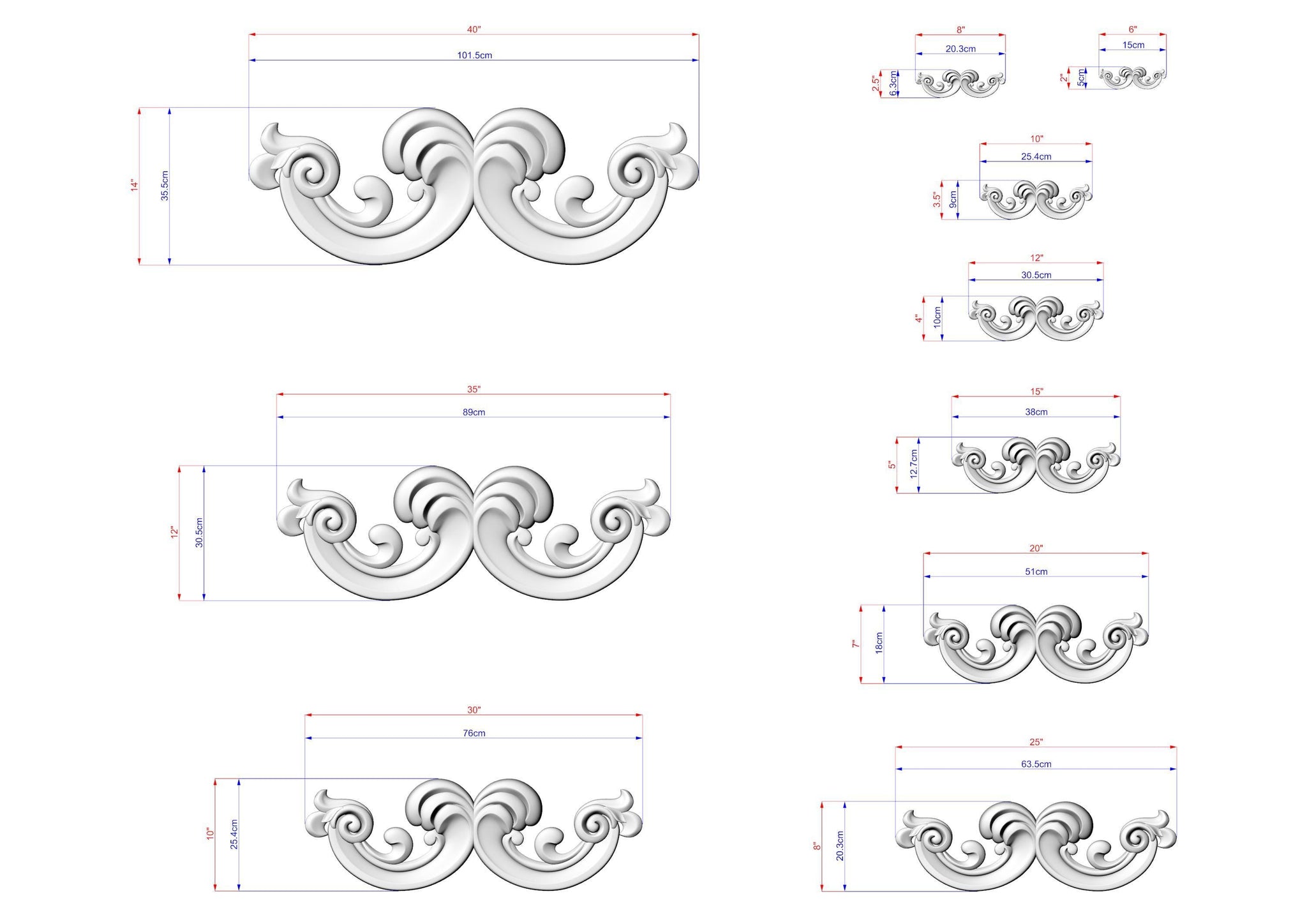 A sculptural composition of opposing scrolls. Compact and expressive, it creates a sense of movement. Suitable for narrow panels or as a mirror top. A timeless touch for classical styling.
