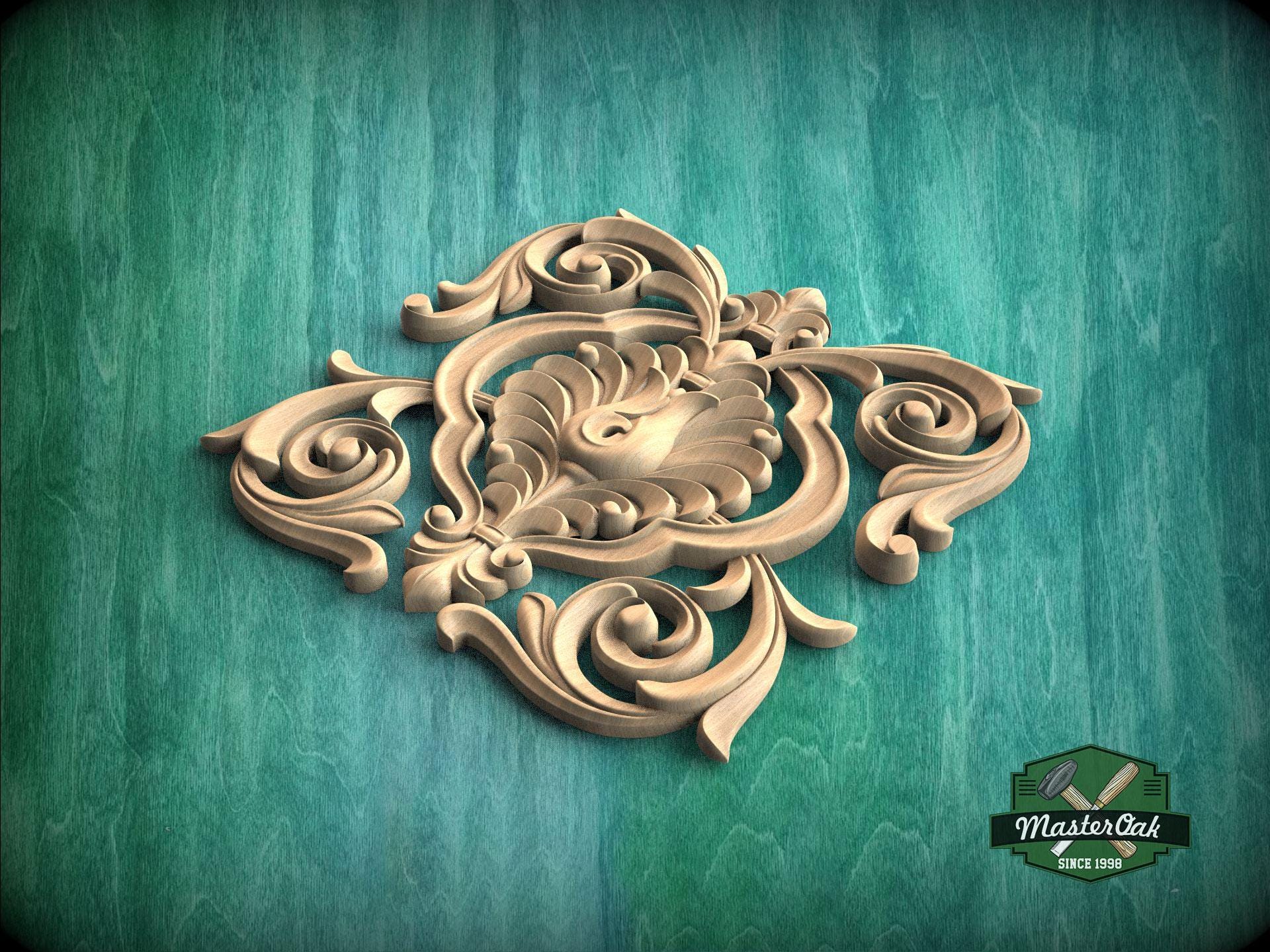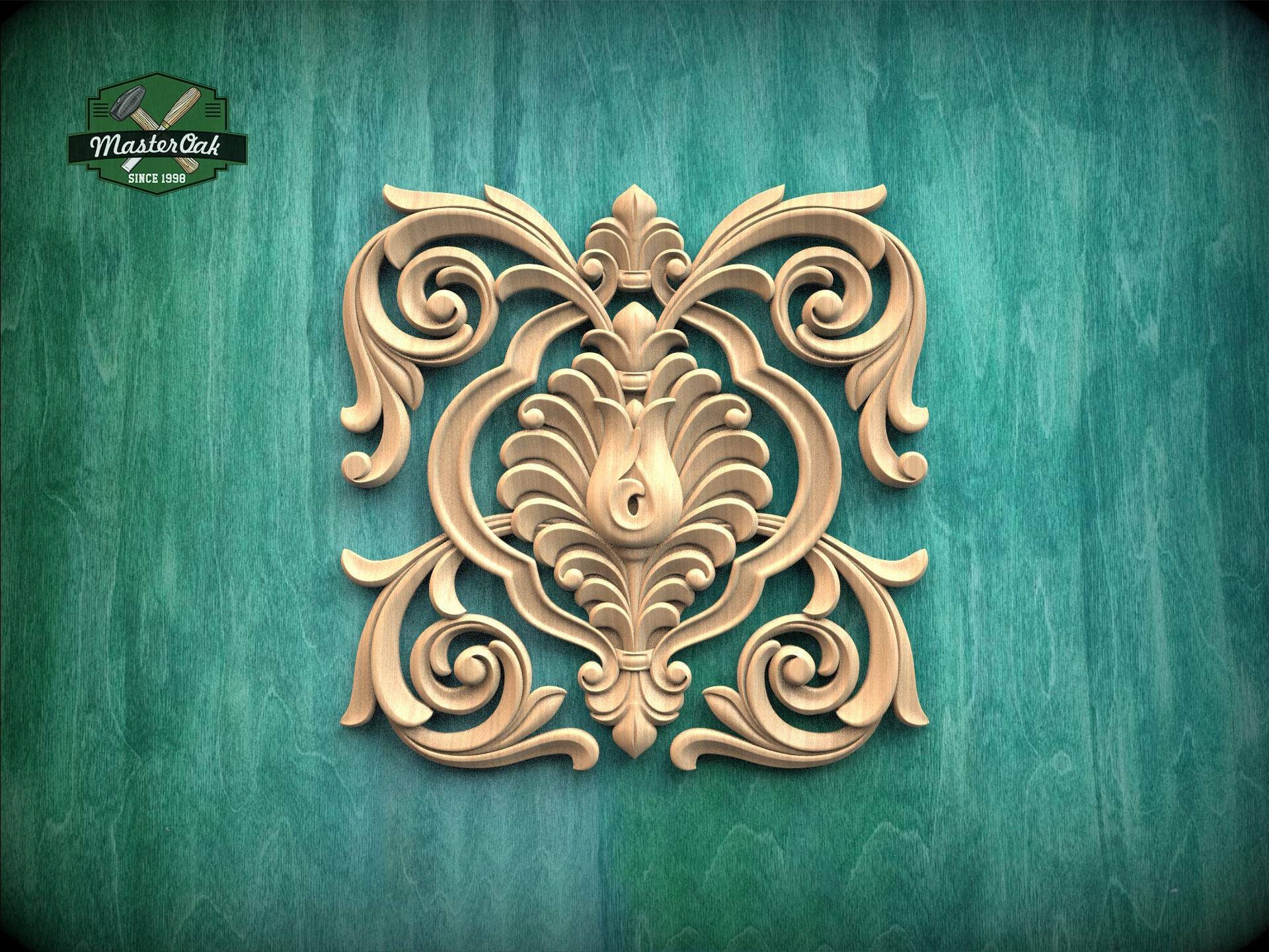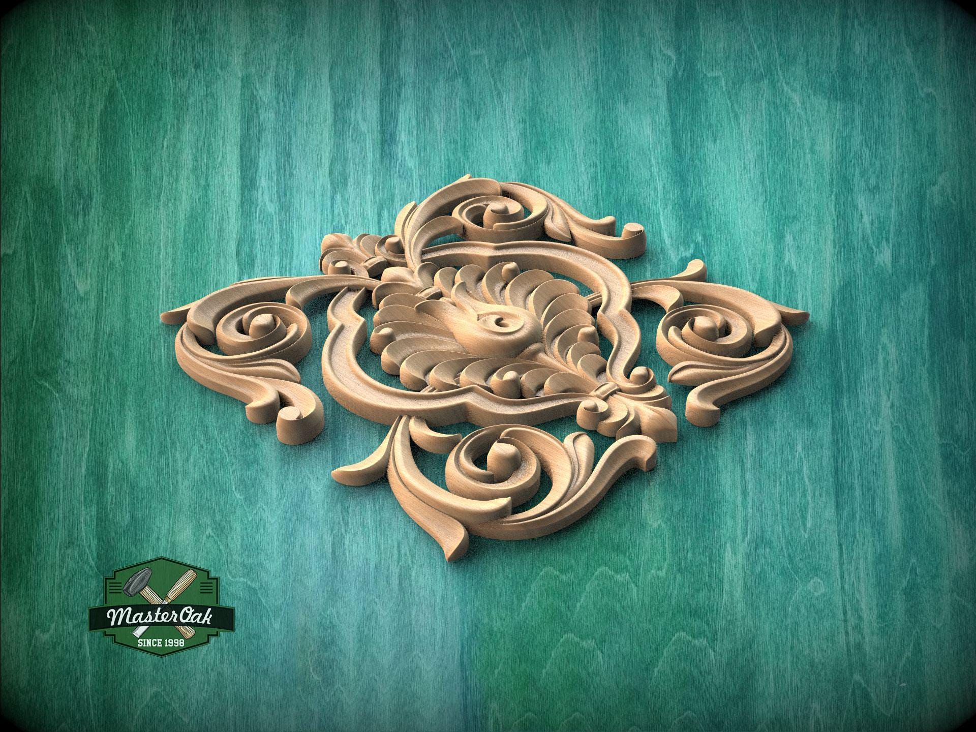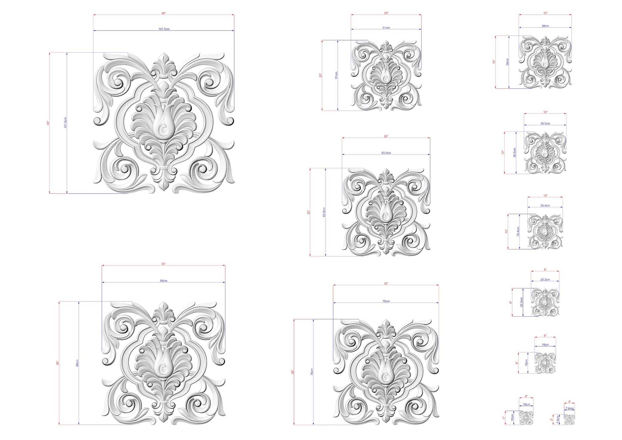 At the center, a voluminous acanthus leaf forms the main motif. Flowing scrolls rise and frame the leaf in a rhythmic pattern. The composition is symmetrical and refined. Suitable for classic furniture, wall panels, or decorative accents.