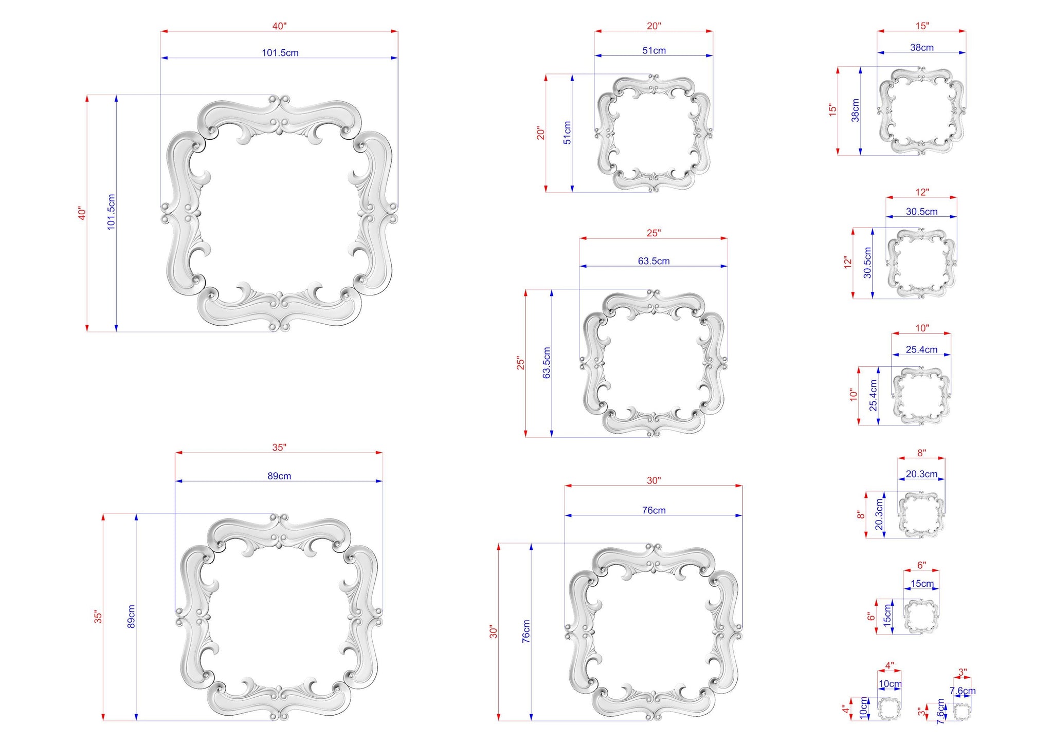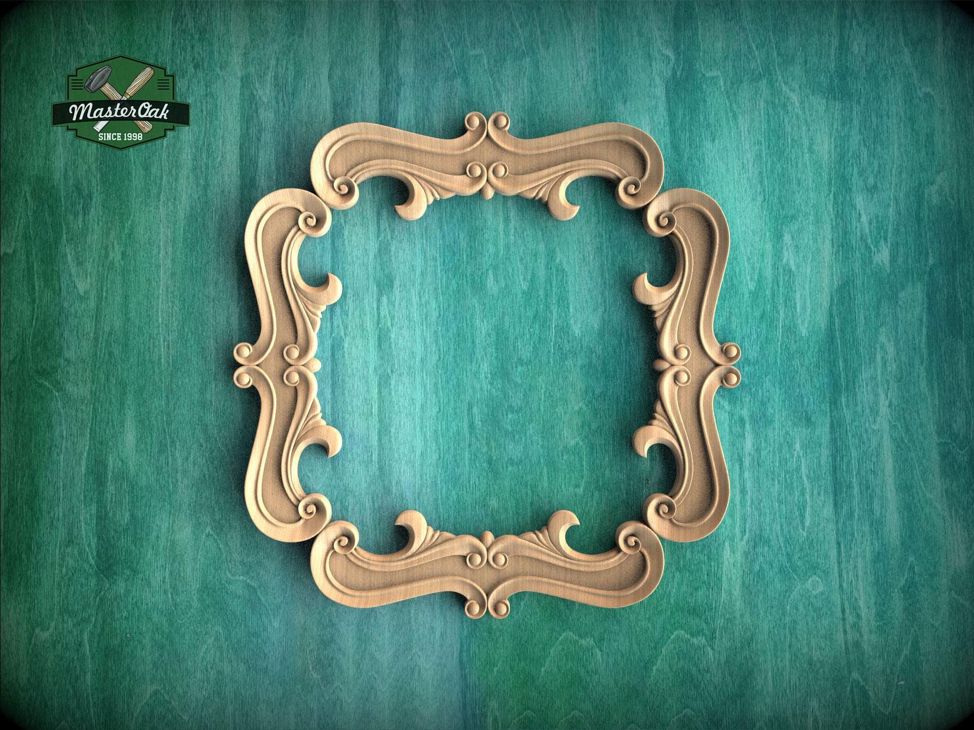 This square frame combines graceful curves with balanced proportions. The scrolling lines create a rhythmic composition reminiscent of baroque architecture. Its soft relief adds depth without excess. Ideal for mirrors, wall décor, or custom cabinetry panels.