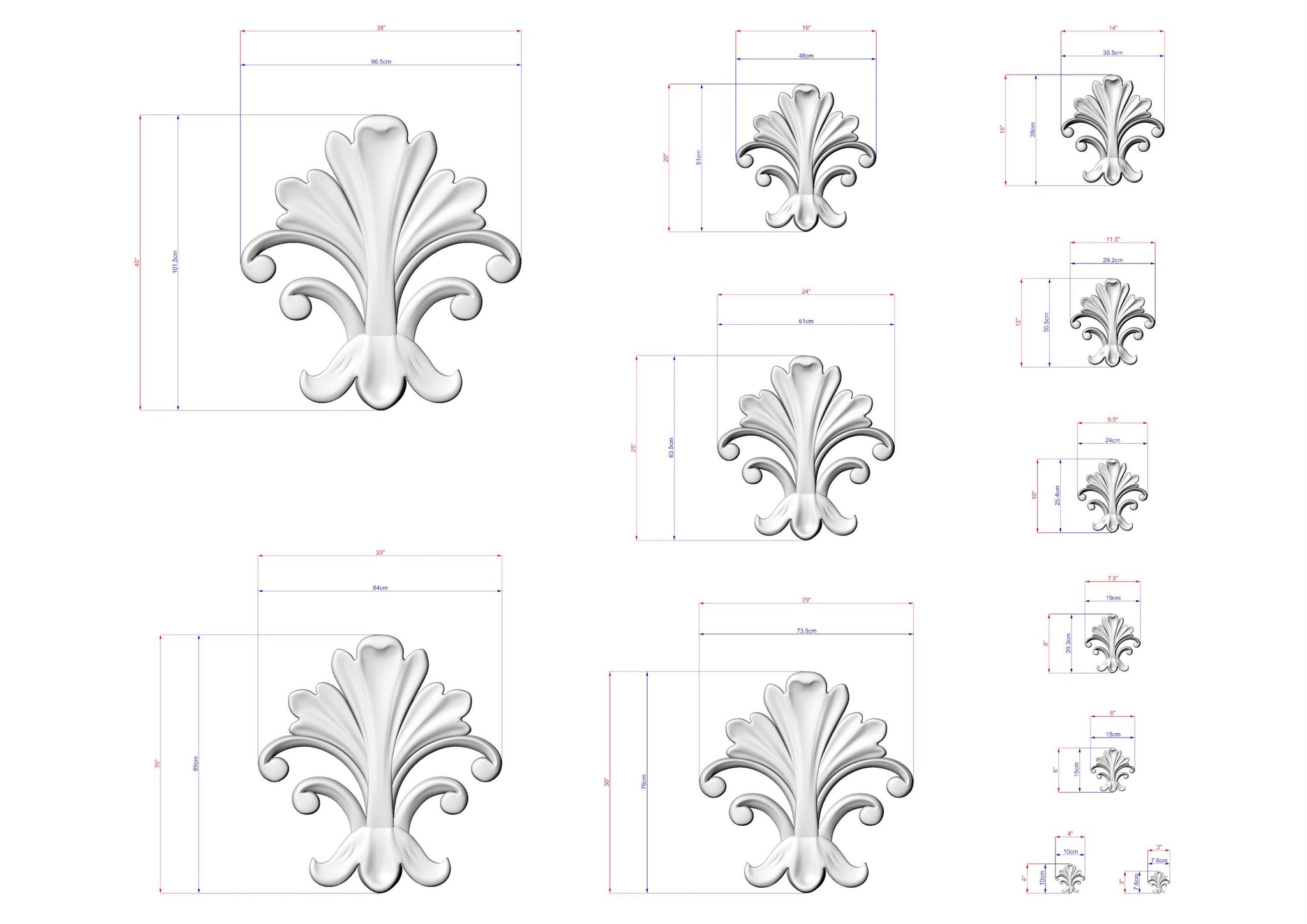 This carving features a stylized acanthus leaf rising upward. The side scrolls add lightness and balance to the design. Its vertical silhouette works beautifully as a decorative highlight. Suitable for panels, doors, or furniture accents.