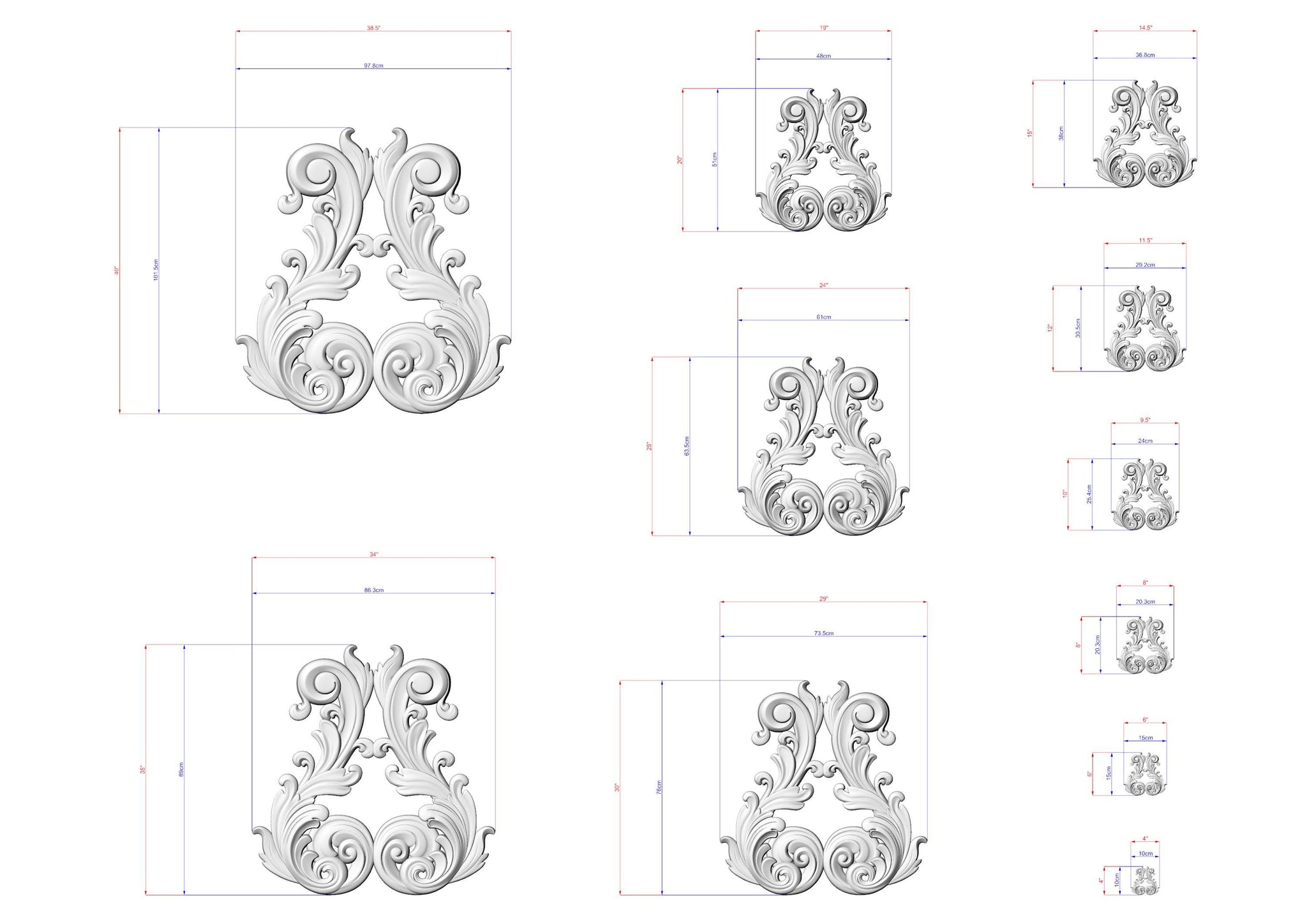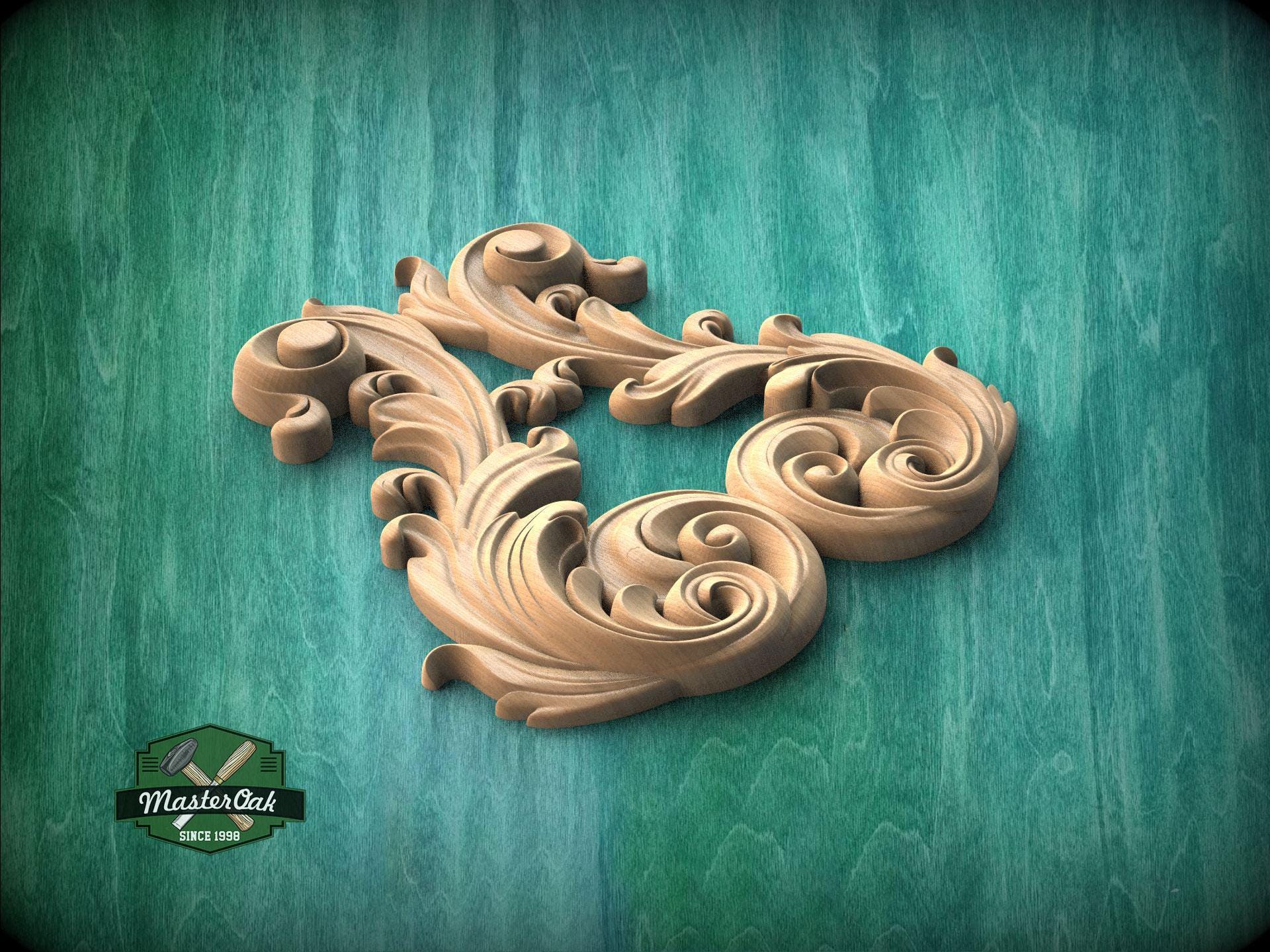 This decorative carving features mirrored acanthus leaves in a graceful vertical composition. The scrolls rise upward, creating movement and harmony. Its refined shape makes it suitable as a focal detail. Perfect for furniture accents, wall panels, or interior highlights.